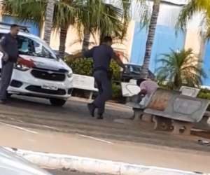 No vídeo (link abaixo) feito por moradores e divulgado nas redes sociais, é possível ver o morador de rua sentado em um banco da praça e o policial militar em pé.